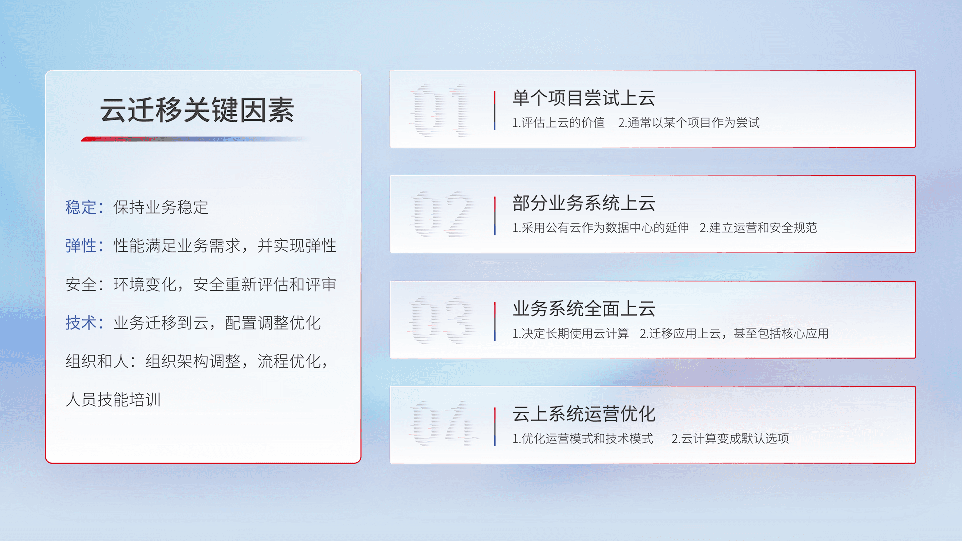 结合实际业务,,,,从规划设计、、云平台选型、、云原生改造、、、数据迁移、、、、集成交付,,迁移全过程为客户识别最佳上云路径,,做好风险识别管理,,设计网络架构、、身份权限、、、、安全审计合规、、、、操作审计、、、、日志审计、、、、监控告警策略、、、多站点容灾设计等,,,对云上基础设施进行整体规划,,,提升IT治理水平,,以满足弹性、、高可用、、、、高性能的需求。。